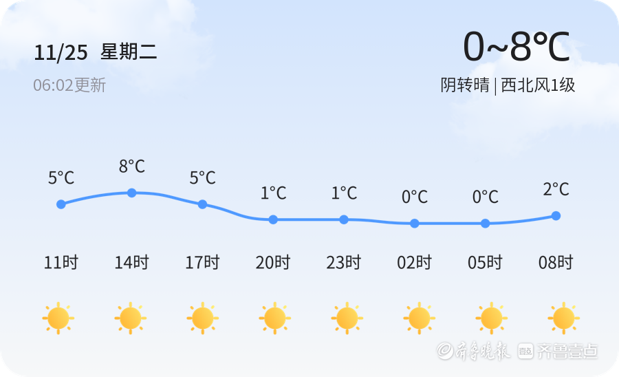 今天是11月25日,星期二,农历十月初六。东营市今日天气由阴转晴,白天气温在0℃至8℃之间,西北风1级,空气湿度为59%。空气质量指数(AQI)为19,属于优等,适合市民外出活动。市民出行时建议根据气温变化适时增减衣物,尤其是早晨和夜间温度较低,需注意保暖。