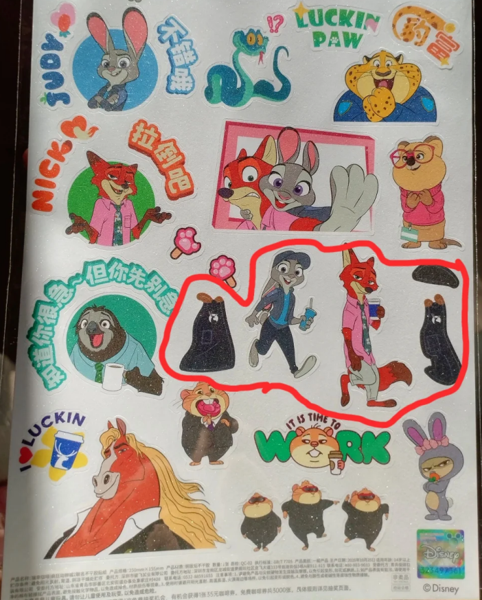 有网友发现,瑞幸为了给疯狂动物城角色朱迪和尼克穿上咖啡围裙,制作了额外的贴纸来保障迪士尼的IP没有被改动。图片来源:小红书。