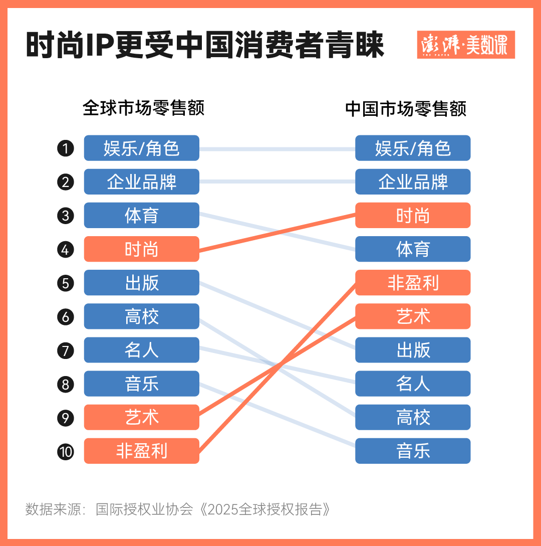 国际授权业协会数据显示,中国在2023年超越德国成为全球第四大IP零售市场,全年IP零售额接近1000亿元。但从人均IP消费来看,中国只有排名第一的美国的人均IP消费的六十分之一,也远低于IP消费市场总量排在前十的其他国家。中国个人IP消费还有很大的增长空间。与全球消费者相比,时尚、非盈利、艺术类IP更受中国消费者青睐。