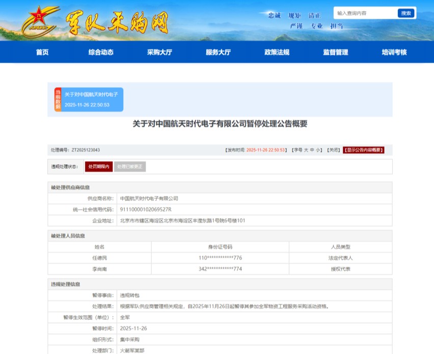 近日,火箭军某部发布一则供应商违规处理公告,中国航天时代电子有限公司因存在“违规转包”行为,被暂停参加全军物资、工程、服务采购活动的资格。