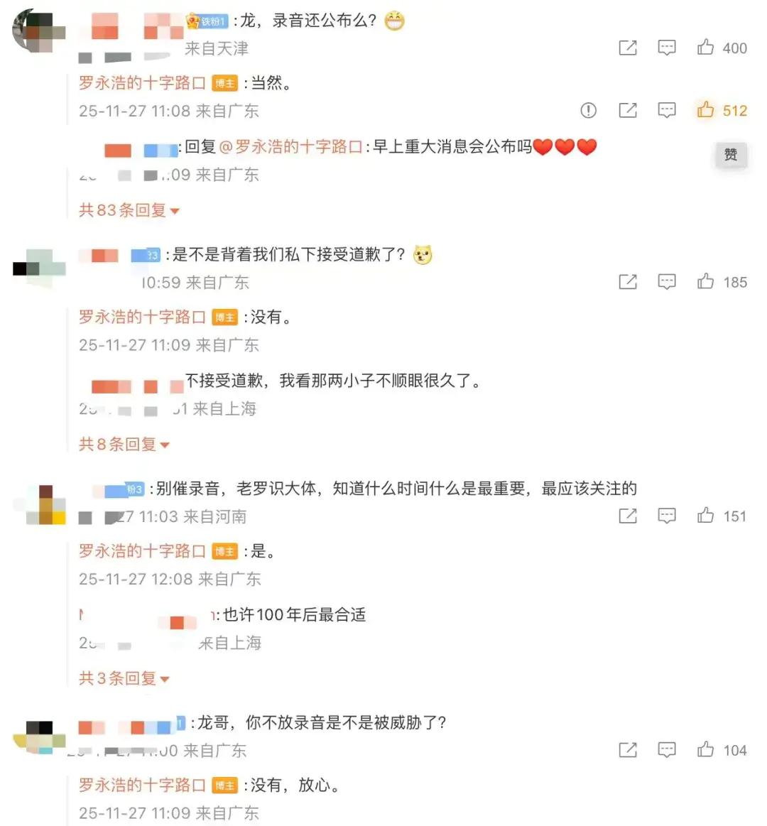 11月27日,有网友在@罗永浩的十字路口 最新一条博文的评论区询问:“录音还公布么?”罗永浩回复称:“当然。”也有网友问:“是不是背着我们私下接受道歉了?”罗永浩回复称:“没有。”还有网友提问:“龙哥,你不放录音是不是被威胁了?”对此,罗永浩回复称:“没有,放心。”