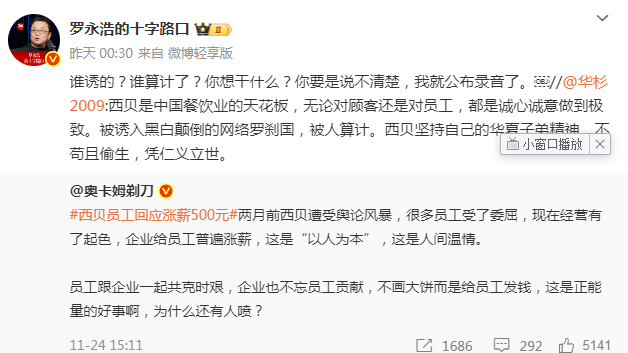 此前,西贝品牌顾问、华与华创始人@华杉2009 发文称,“西贝是中国餐饮业的天花板,无论对顾客还是对员工,都是诚心诚意做到极致。被诱入黑白颠倒的网络罗刹国,被人算计。西贝坚持自己的华夏子弟精神,不苟且偷生,凭仁义立世。”