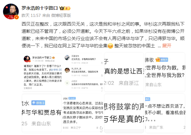 随后,11月26日,罗永浩再发文称:“西贝正在整改,这次跟西贝无关,这次是我和华杉之间的事。华杉这次再跟我私下道歉已经不管用了,必须公开道歉。今天下午六点之前,如果华杉没有在微博公开道歉,未来中国的市场公关行业应该不会有人再记得华与华了,只记得罗与华。顺便说一下,我已经在网上买了华与华的全集。整天被忽悠的中国土老板们,其实赚钱很不容易,也该有人给他们上一点营销防诈课了。”