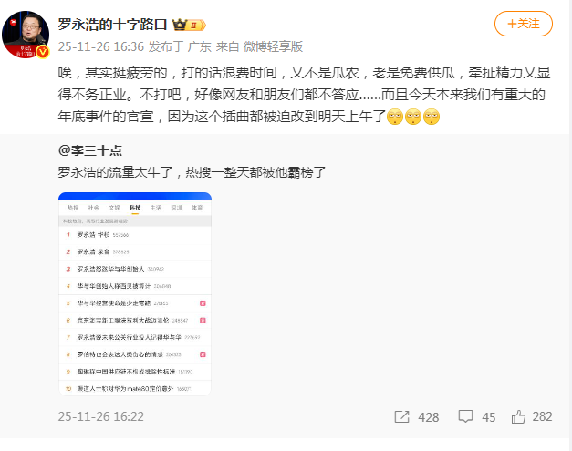26日下午4时,罗永浩再发文:“唉,其实挺疲劳的,打的话浪费时间,又不是瓜农,老是免费供瓜,牵扯精力又显得不务正业。不打吧,好像网友和朋友们都不答应……而且今天本来我们有重大的年底事件的官宣,因为这个插曲都被迫改到明天上午了。”