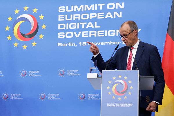 11月18日,在德国柏林,德国总理默茨在“欧洲数字主权峰会”新闻发布会上讲话。新华社