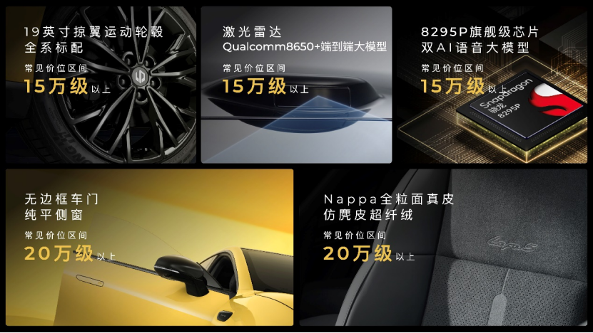新车提供3款质感内饰,速域紫时尚动感,驰影灰格调沉稳,竞速灰则采用5.54m²仿麂皮超纤绒+Nappa全粒面真皮拼接,座椅上的"延伸赛道"纹理与"Lafa5"专属字标烫印,尽显超跑级座舱质感。Leap Sound12扬声器音响系统配合无麦K歌功能,带来舞台级听感,座舱秒变私人LiveHouse。1.02㎡超大全景天幕搭配智能电动遮阳帘,以及多达25处的储物空间和435L的后备箱容积,则充分体现了对用户日常实用需求的深度洞察。
