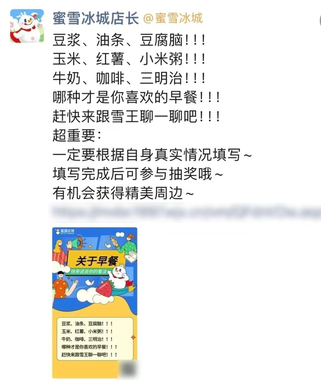 此前,有多位网友反映收到了来自蜜雪冰城发出的关于早餐选择的调查问卷,在早餐类型上提供了五谷杂粮、蛋类、奶制品、油炸类等多个选项系列,每个系列又含有两三种细分产品,并对受访者的吃早餐频率、时间等均有涉及。