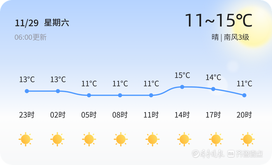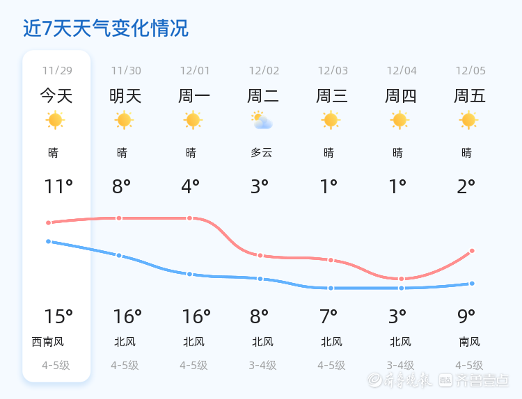 今天是2025年11月29日,农历十月初十,星期六。青岛市今天天气晴朗,气温适宜。全市范围内,今天的最低气温为11℃,最高气温达到15℃,风力较小,南风3级,空气湿度70%,PM2.5指数为101,属于良好水平。各区天气状况基本一致,均为晴朗天气,适合市民户外活动。 明天青岛市将继续保持晴朗天气,但气温有所下降。最低气温将降至8℃,最高气温为16℃,风力增大,北风4-5级。与今天相比,明天的气温变化不大,但风力增强,市民出行时需注意防风保暖。 未来三天,青岛市将以晴好天气为主,气温呈现下降趋势。最低气温将降至4℃,最高气温为16℃。特别是周一和周二,气温较低,市民需及时增添衣物,防范感冒。周三起,气温略有回升,但风力依然较大,建议市民出行时注意安全,防范大风可能带来的不利影响。 温馨提示