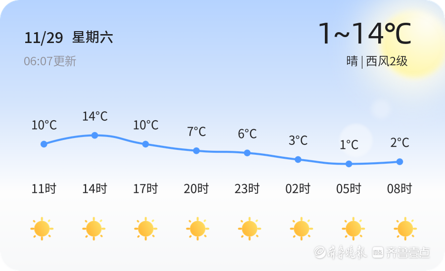 今天是11月29日,星期六,农历十月初十。临沂市迎来晴朗天气,最高气温14℃,最低气温1℃,目前气温6℃,西风2级,空气湿度64%,PM2.5指数107。全市各区天气状况一致,均为晴天,适宜市民户外活动。