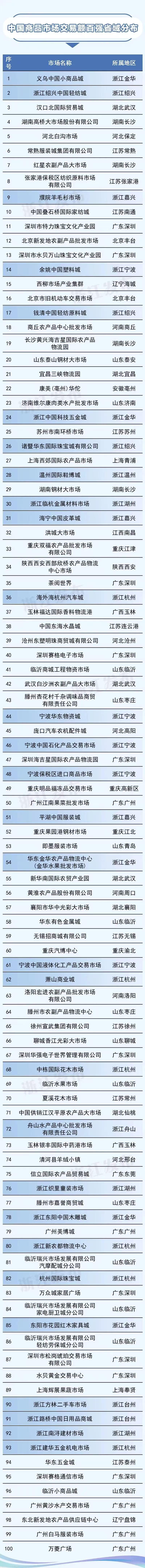 近日,第十四届中国商品市场论坛在杭州举办。论坛现场,中国社会科学评价研究院发布《中国商品市场发展报告》,其中“中国商品市场交易额百强”名单正式出炉。在全国最具竞争力的百家商品交易市场中,临沂有7个市场上榜,数量居全省第1位。