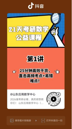 据悉,本次公益课程将于11月30日起每日10:00通过山东应用数学中心官方视频号、抖音号、小红书及哔哩哔哩等平台更新。每节课时长控制在25分钟以内,重点针对考研数学中的高频考点与易错题型进行精细化讲解,帮助考生在有限时间内实现高效备考。