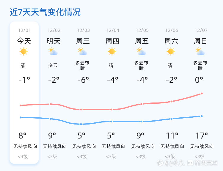 今天是12月1日,星期一,农历十月十二。淄博市今日天气晴转多云,气温在-1℃至8℃之间。各区天气总体平稳,以晴好天气为主,适合市民进行户外活动。明天12月2日,淄博市天气以多云为主,气温较今日略有上升,最低气温-2℃,最高气温9℃。风力较小,以无持续风向为主。未来三天,淄博市天气趋势为多云转晴,气温变化较大,最高气温可达9℃,最低气温将降至-6℃。其中,12月3日(周三)低温较低,市民需注意保暖。温馨提示