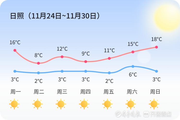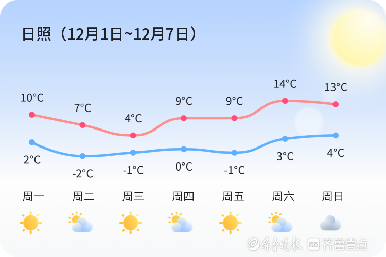 上周(11月24日~11月30日)我市晴天比较多。 全市周平均最高温12℃,平均最低温3℃,平均气温7℃,周最高气温18℃,出现在周日,周最低温2℃,出现在周二、周五。 具体气温变化情况如下图。 本周总体以晴、多云为主基调,可能还会有阴等天气。具体天气情况请关注每日天气情况预告。 本周气温变化情况: 最低气温-2~4℃,最高气温4~14℃。 需要关注及时最新预报。 具体气温变化情况如下图。