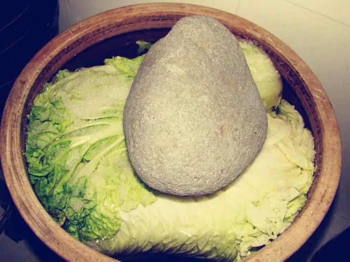 一周后,白菜被晒蔫了许多,便可以开始渍酸菜了。渍酸菜有几道工序:母亲要先烧沸满满一大锅开水,再把晾晒好的白菜投入沸水中浸烫一下,浸烫一两秒钟之后捞出来放在稍稍倾斜的桌面上沥干水,最后把沥干水的白菜一层层码进酸菜缸里。每码一层,就均匀地撒上一把大盐粒。母亲因个子矮小,刚开始往缸底码白菜时,手臂够不到底儿。但母亲自有她的办法,她搬来几块砖头垫在脚底,站上去手臂就能轻松够到缸底了。白菜码满缸后,要在上面压上一块干净的、有些重量的石头。先不要立即往缸内加水,要等到第二天早上再加入清水。水量最好一次加好,不然水量加多了会“冒缸”,水量加少了会“烂缸”。母亲渍酸菜经验丰富,加水量总是拿捏得很准。