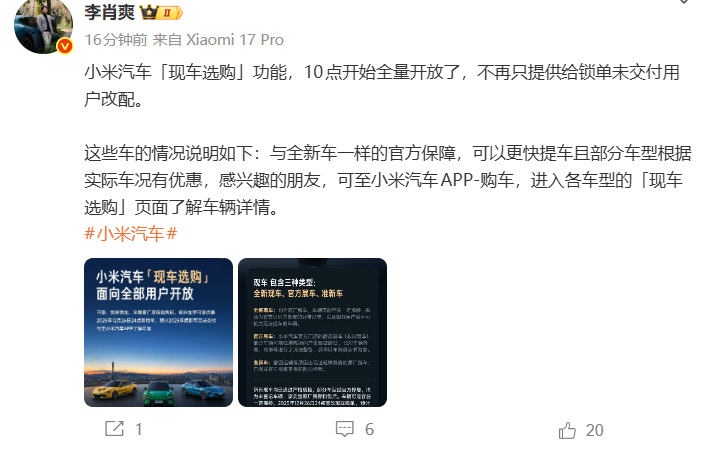 小米汽车副总裁李肖爽也在社交平台发文:小米汽车“现车选购”功能,10点开始全量开放了,不再只提供给锁单未交付用户改配。这些车的情况说明如下:与全新车一样的官方保障,可以更快提车且部分车型根据实际车况有优惠,感兴趣的朋友,可至小米汽车APP-购车,进入各车型的「现车选购」页面了解车辆详情。
