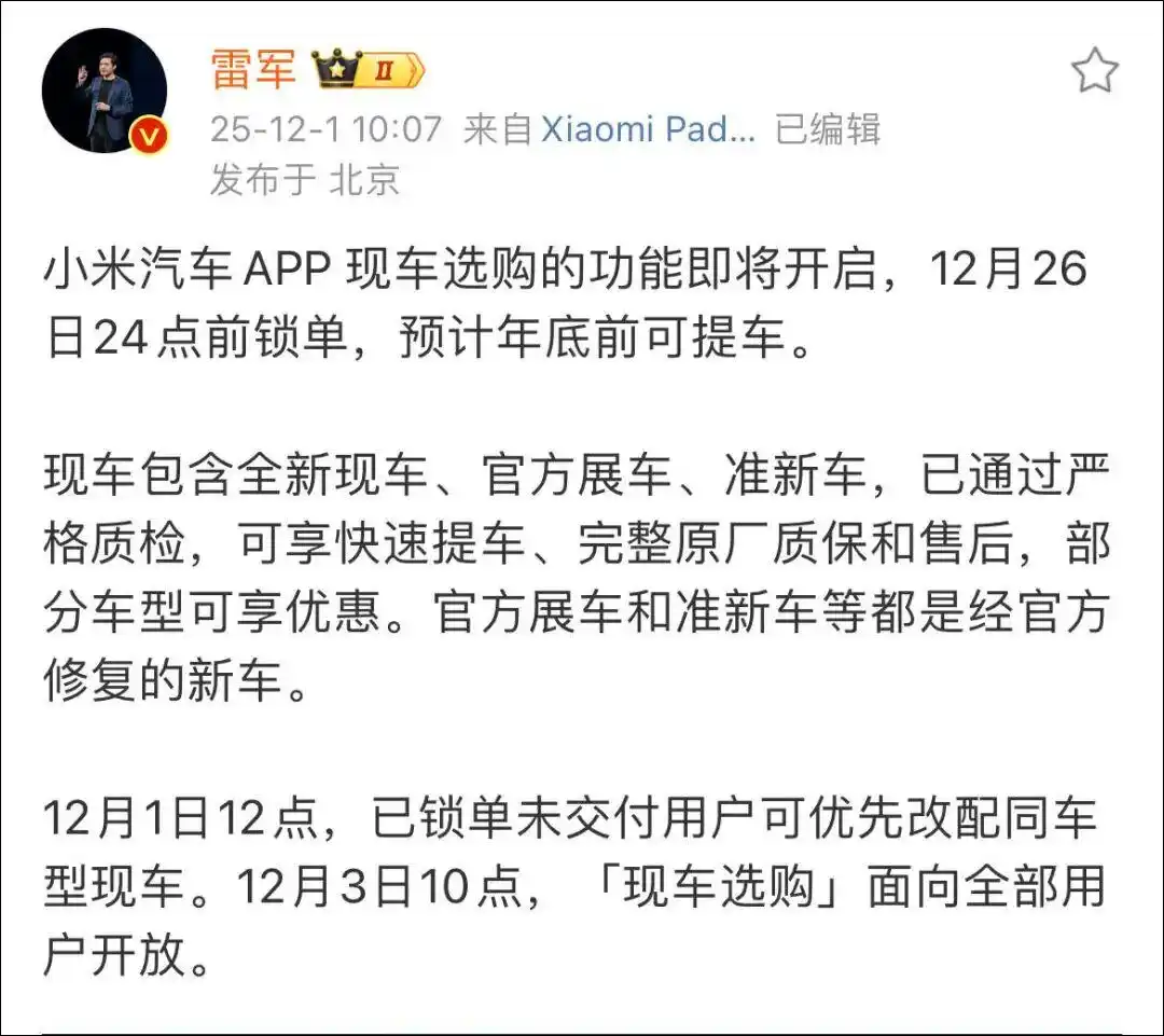 据悉,12月1日,雷军发文:小米汽车APP现车选购的功能即将开启,2025年12月26日24点前锁单,预计年底前可提车。