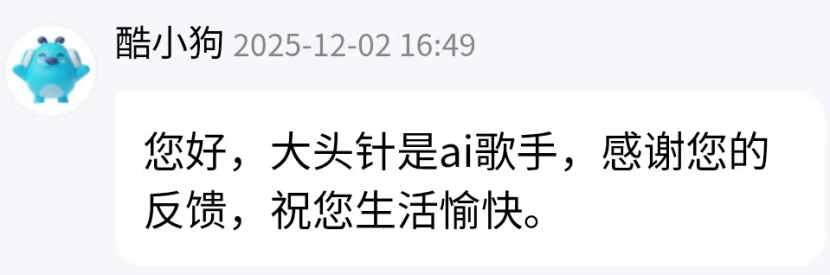 齐鲁晚报·齐鲁壹点就“大头针AI”的身份向酷狗音乐客服求证,客服确认其确实是AI歌手。但12月3日晚,“大头针”更新了个人简介,称:“我大头针本人和酷狗阿波罗声音实验室的大头针AI,是两回事!大家千万认清,歌曲大家仔细听是不一样的,风格也不一!”