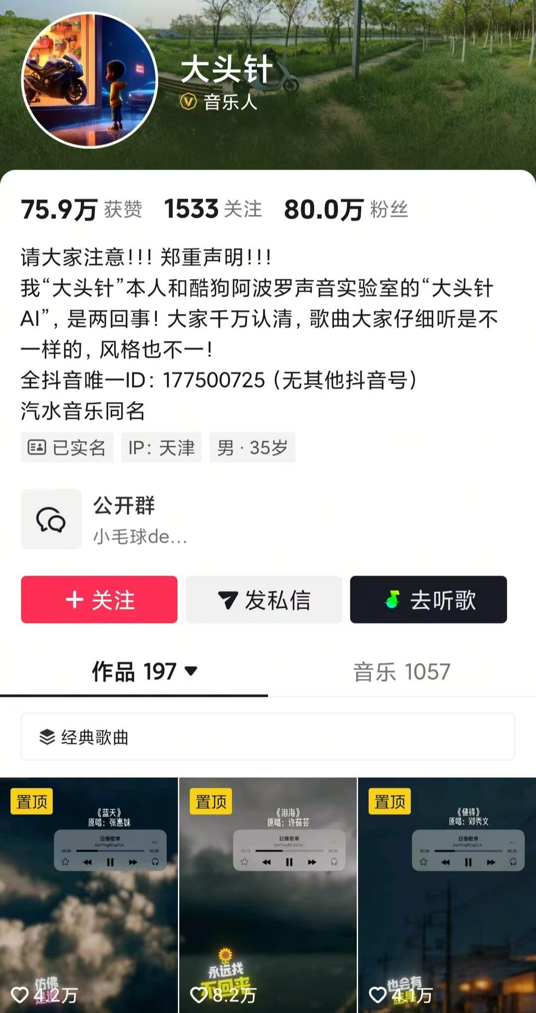 但12月3日晚,“大头针”更新了个人简介,称:“我大头针本人和酷狗阿波罗声音实验室的大头针AI,是两回事!大家千万认清,歌曲大家仔细听是不一样的,风格也不一!”