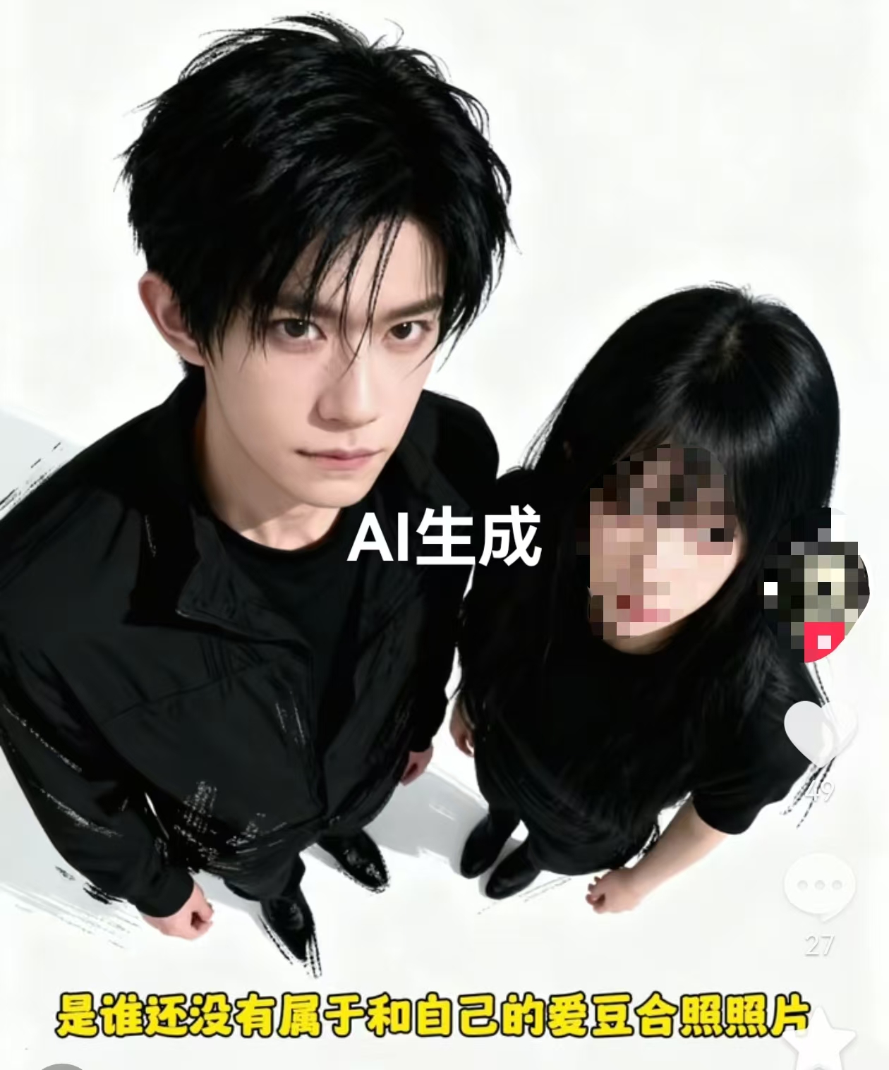 “用照片的两个人物,写真风格的摄影画面,身穿黑色衣服,以俯视视角呈现在简洁白色背景上,画面整体偏冷色调……”社交平台上,有博主分享了通过此类文本指令,用AI生成逼真合影的过程。
