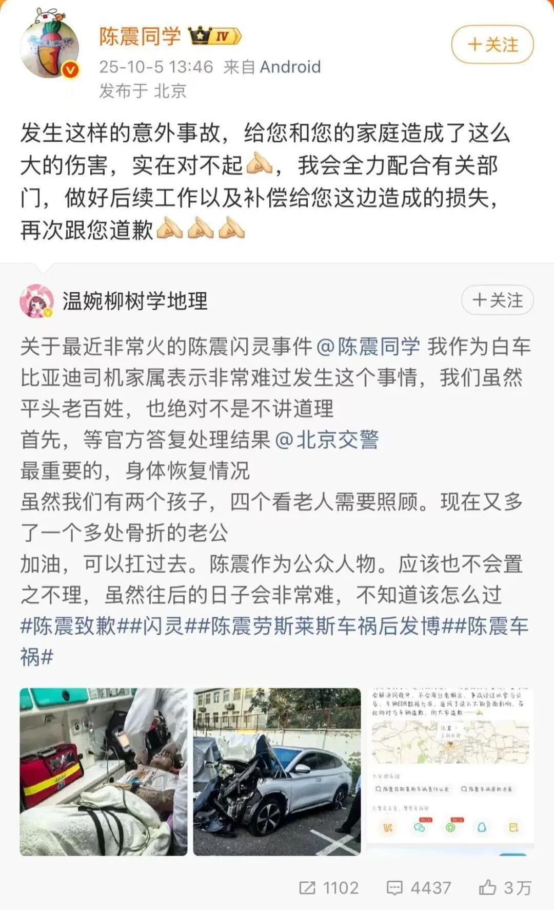 10月5日下午,汽车博主陈震在微博发文就事故再次道歉:发生这样的意外事故,给您和您的家庭造成了这么大的伤害,实在对不起,我会全力配合有关部门,做好后续工作以及补偿给您这边造成的损失,再次跟您道歉。