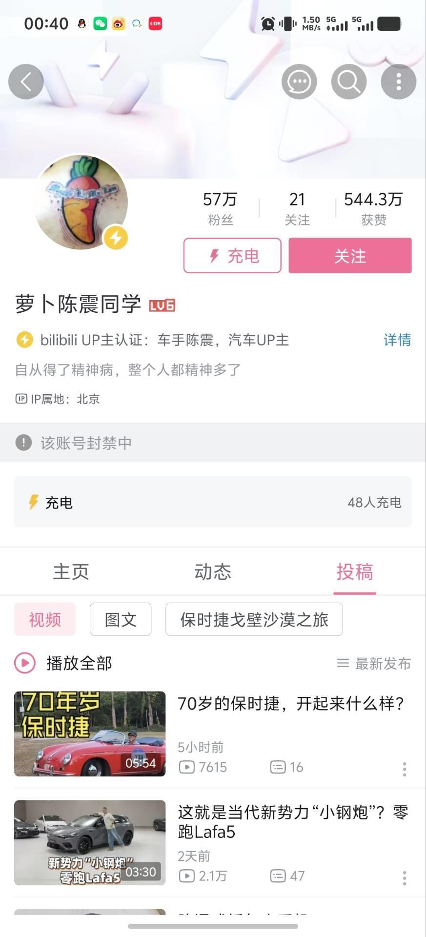 抖音、快手、小红书平台显示,该用户因违反相关法律法规和政策,已被禁言。B站则显示其账号已被封禁。微博账号短暂禁言后又恢复正常。