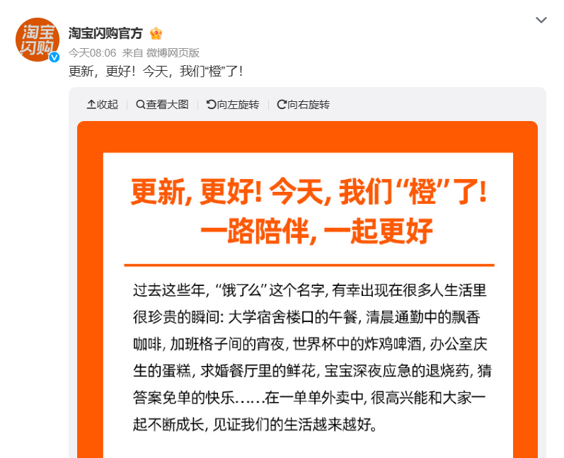 12月5日,淘宝闪购官方微博账号发文:“更新,更好!今天,我们“橙”了!” 值得注意的是,淘宝闪购官方微博账号