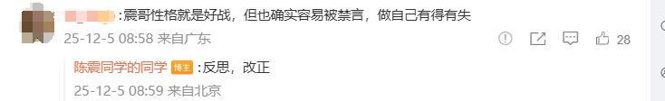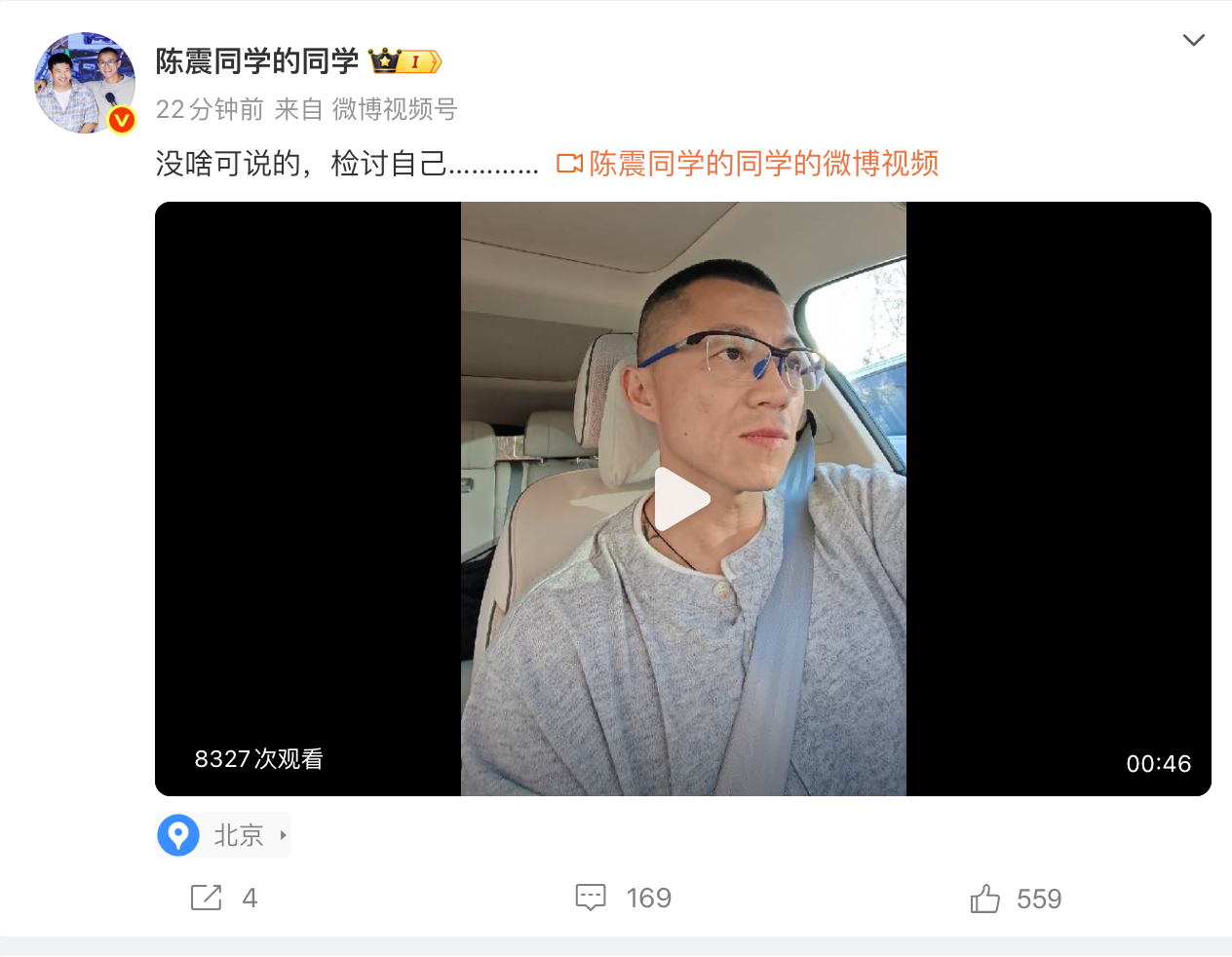 12月4日晚,陈震多平台被禁言引发热议,对此,其小号@陈震同学的同学 发文回应称“没啥可说的,检讨自己……………”陈震在视频中表示:这事儿早上起来看到之后确实也有一点突然,但也没什么可说的,自作自受,多检讨自己。