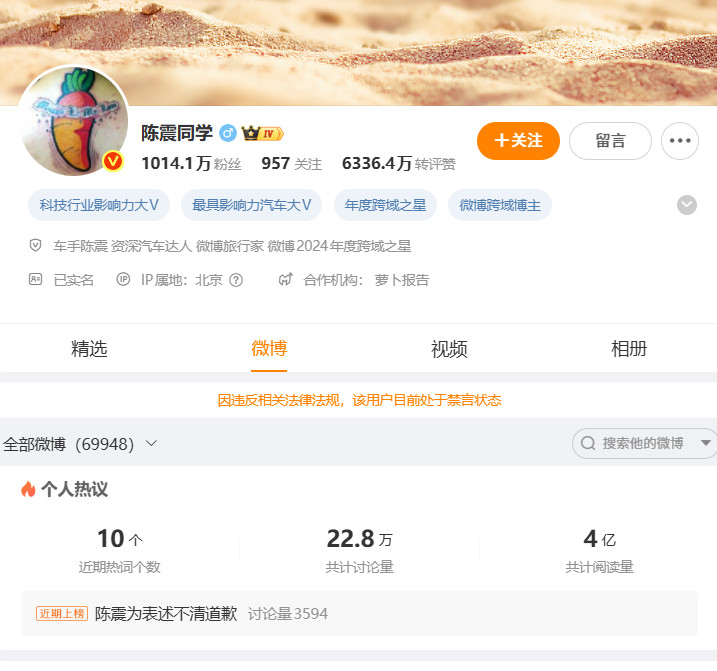全网拥有2400多万粉丝的陈震多平台被禁言,小号回应称:自作自受,检讨自己