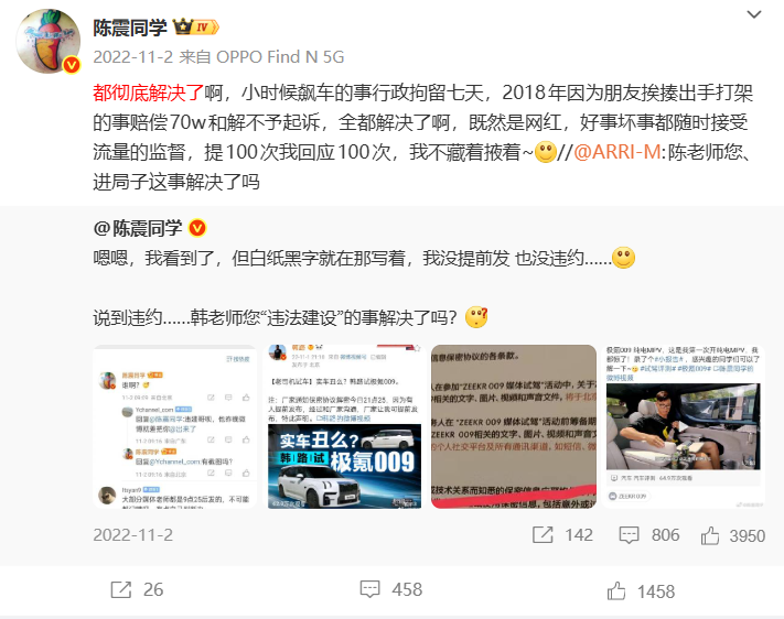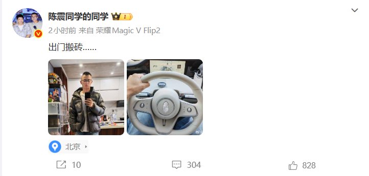 12月5日,陈震小号发文:“出门搬砖……” 并晒出自拍,回应网友评论。