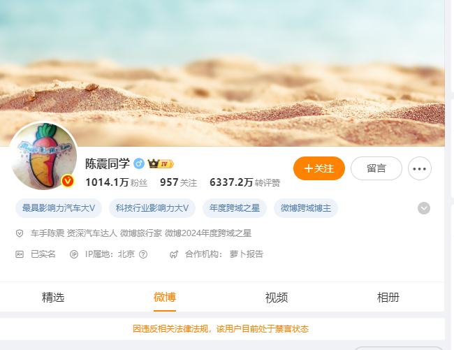 12月4日深夜,车圈顶流博主、拥有全网超2400万粉丝的知名车评人陈震遭遇"全网静音",其在抖音、快手、小红书、B站、今日头条等多个主流社交平台的账号相继被禁言或封禁。