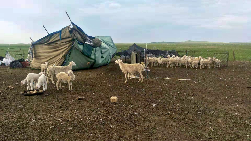 草原上风大,有时会把搭建的棚圈吹倒,羊只好站在风雨里。