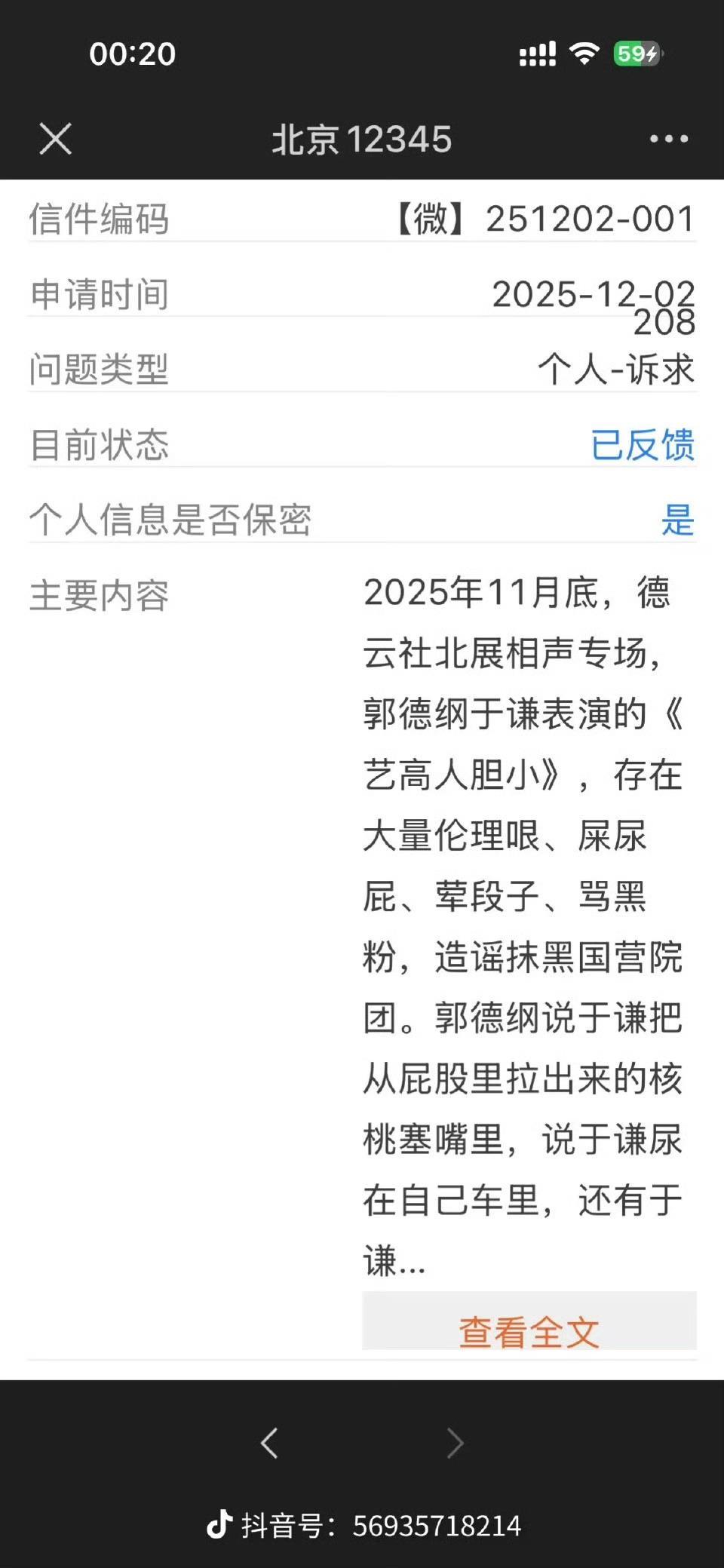 此外,网络上还有两张截图流传甚广。一张为网友12月2日提交给北京12345的投诉截图,图中投诉内容为:“2025年11月底,德云社北展相声专场,郭德纲于谦表演的《艺高人胆小》,存在大量伦理哏、屎尿屁、荤段子、骂黑粉,造谣抹黑国营院团(等台词)。”