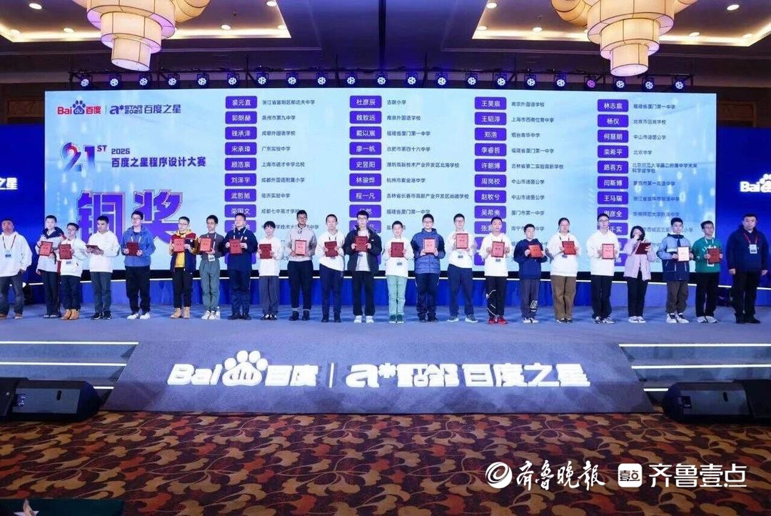 12月7日,被称为“技术界奥斯卡”的2025百度之星程序设计大赛总决赛在北京落下帷幕。烟台青华中学高一年级的王茂骅同学以全场唯一做出10题的成绩,从众多优秀的大学生、中学生中脱颖而出,夺得总冠军。同时,八年级的郑浩同学获得全国铜奖。