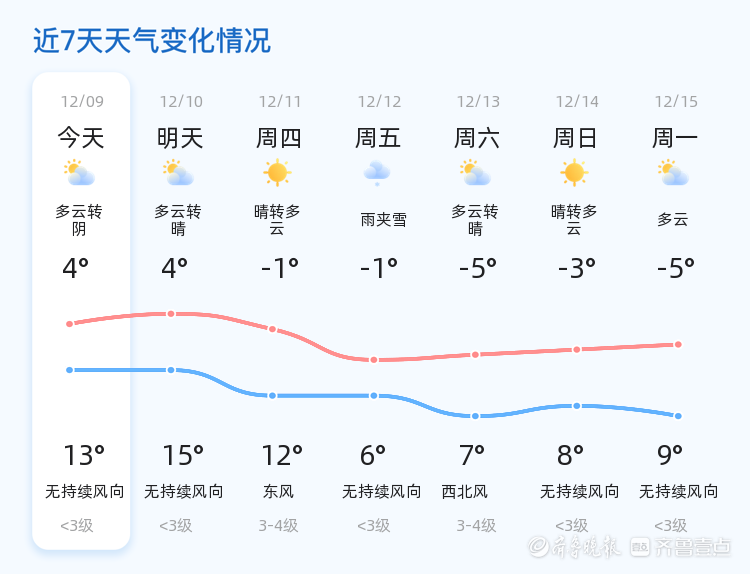 今天是12月9日,星期二,农历十月二十,济宁市迎来多云天气。全市各区气温在4℃至13℃之间,东南风1级,空气湿度49%,PM2.5指数为89。目前实时气温为4.7℃,整体天气状况平稳。