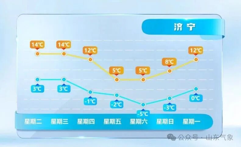 10日夜间到13日山东省气温持续下降 ,最低气温降温幅度8℃左右,14日早晨气温降至最低,鲁西北和鲁中山区-10~-8℃,沿海地区-4~-1℃,其他地区-7~-5℃。