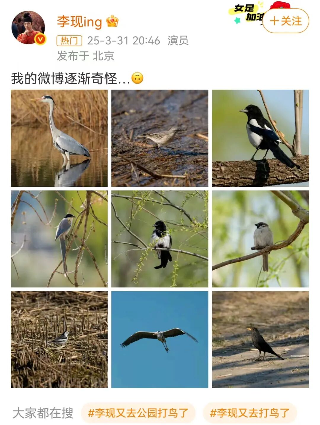 今年3月,有多位网友在北京公园里,偶遇背着专业设备打入大爷摄影团的李现。虽然他包裹严实,还是被网友认了出来。有网友调侃,“李现设备不如大爷的。”随后李现晒出多张鸟的照片。