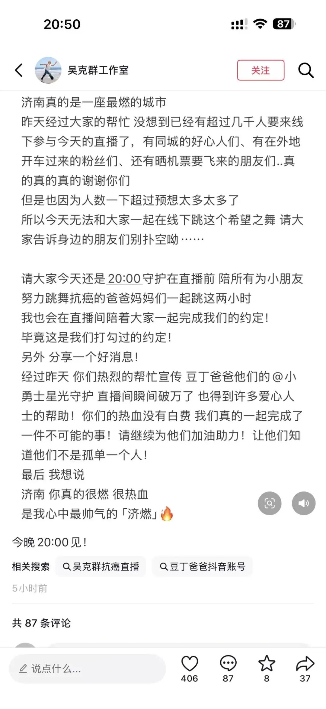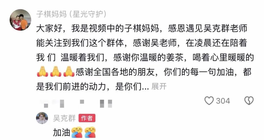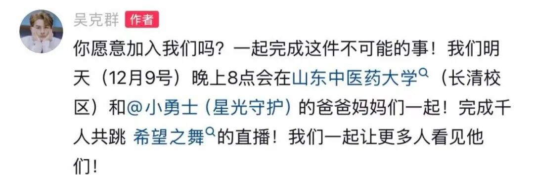 视频发布后,吴克群在评论区补充道:你愿意加入我们吗?一起完成这件不可能的事!我们12月9号晚上8点会在山东中医药大学(长清校区)和@小勇士(星光守护) 的爸爸妈妈们一起!完成千人共跳希望之舞的直播!我们一起让更多人看见他们!
