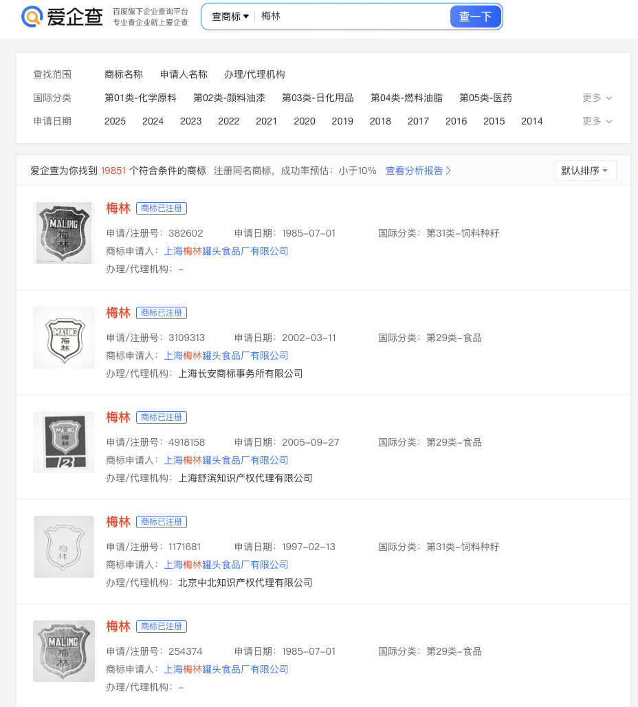 资料显示,光明肉业是国内最大的食品生产和销售企业之一,其午餐肉、蜂蜜等产品市占率领先,还拥有“大白兔”、“冠生园”等知名子品牌。爱企查App显示,上海梅林罐头食品厂有限公司已成功注册多枚“梅林”商标,国际分类涉及食品、啤酒饮料等。
