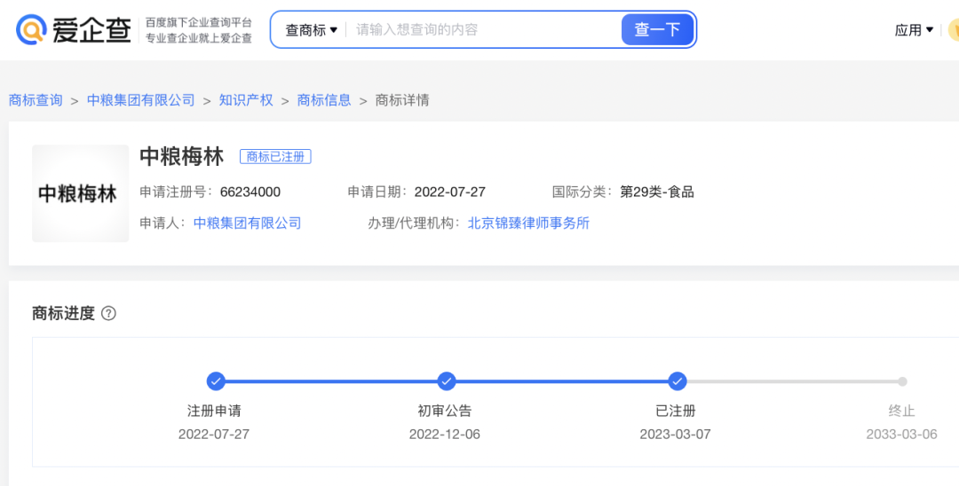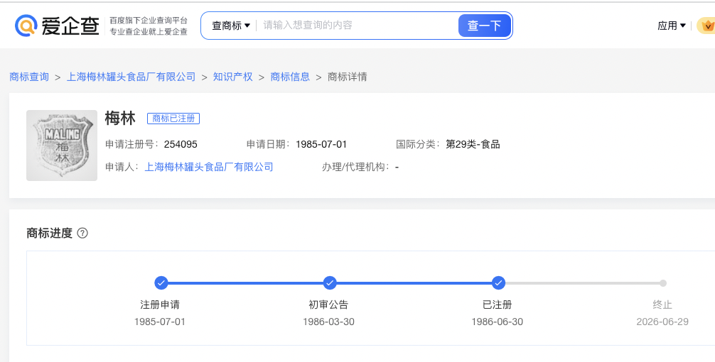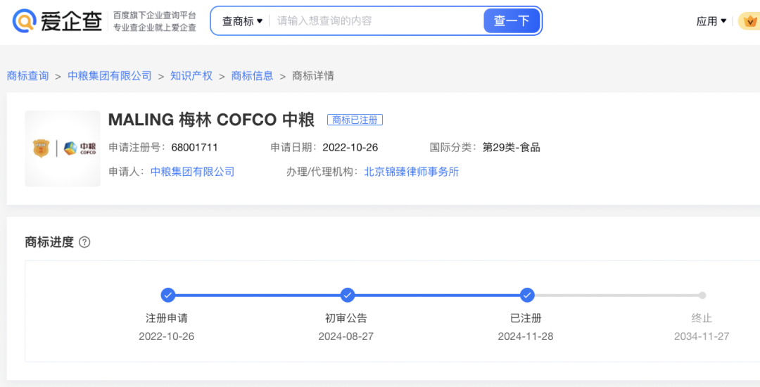 中粮梅林官方公众号显示,中粮集团是中国罐头出口业务的开拓者,包括“梅林”商标在内的罐头品牌由中粮集团统一对外出口使用。2010年开始,中粮集团“梅林”品牌肉类罐头进入境内市场销售。爱企查App显示,中粮集团有限公司已成功注册“中粮梅林”“MALING 梅林 COFCO 中粮”商标,国际分类涉及食品。