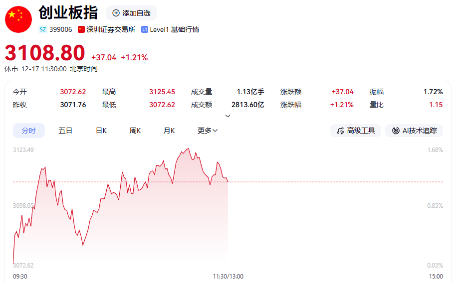 今天(12月17日)上午,A股市场主要指数涨跌互现,创业板整体走强。