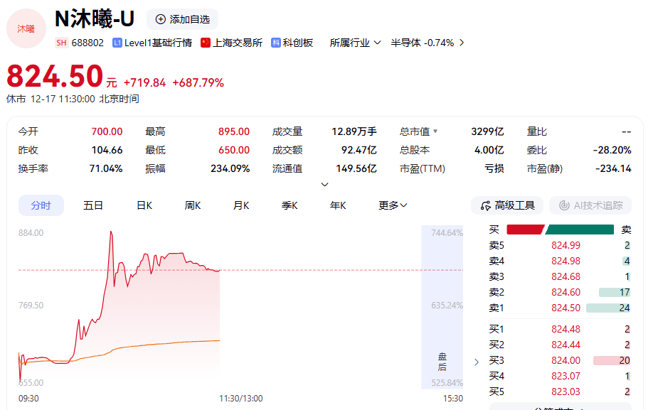 上午开盘沐曦股份报700元/股,盘中最高达到895元/股,若按照此价格计算,投资者中一签沐曦股份新股浮盈接近40万元,达39.5万元,超过此前摩尔线程创造的年内新股上市首日单签最高浮盈纪录。截至上午收盘,沐曦股份报824.5元/股,涨幅达687.79%,总市值超过3000亿元。