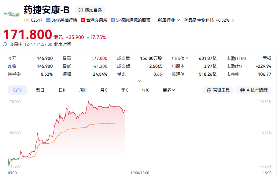 港股通标的股中,药捷安康-B走强,盘中涨幅一度超过20%。