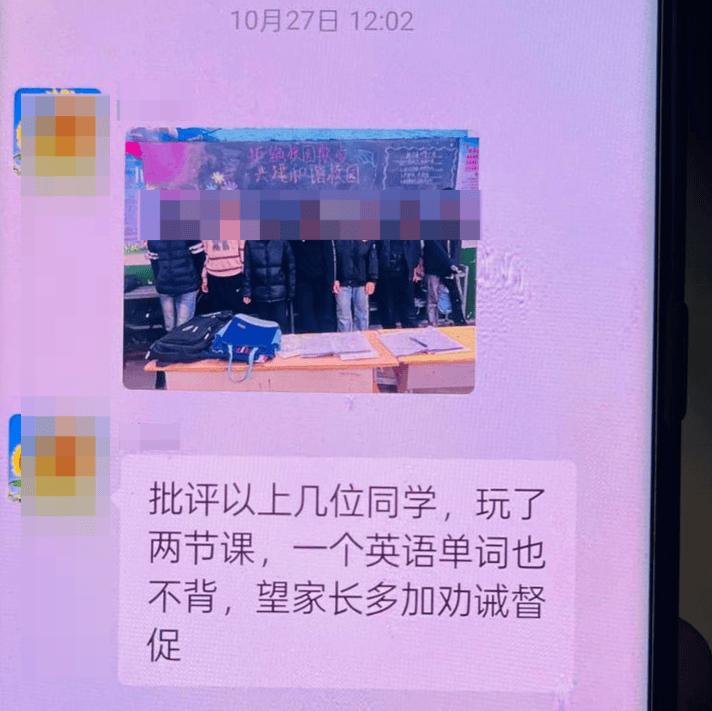 聊天记录显示,在班级90个人的家长群里,10月27日上午12点02分,有老师发布了一张照片。包括小川在内,有7个同学并排站在教室后排:“批评以上几位同学,玩了两节课,一个英语单词也不背,望家长多加劝诫督促。”但直到当天下午两点半,才有家长回应老师:会跟孩子“好好谈谈”。