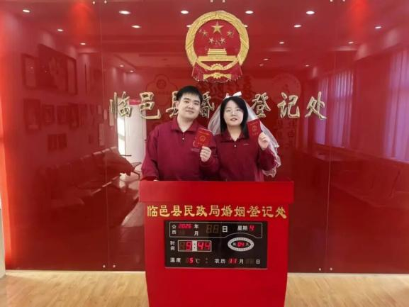 临邑县婚姻登记处洋溢着甜蜜的气息,迎来新年首批登记新人。办理现场,工作人员向新人发放婚事新办倡议书,送出“白头偕老、家庭美满”的真诚祝福,积极倡导简约适度、文明健康的婚恋风尚。