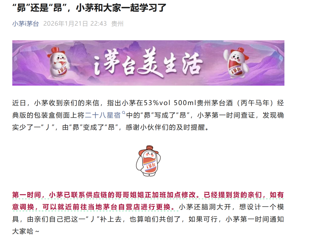 当日晚间,“小茅i茅台”微信公众号发文表示,经第一时间查证,发现确实少了一“丿”,由“昴”变成了“昂”,公司已在第一时间联系供应链加班加点修改,并提醒已经提到货的消费者,如有意调换,可就近前往当地茅台自营店进行更换。同时,茅台还提出设计一个模具,由消费者自己把这一“丿”补上去,如果可行,将第一时间通知。