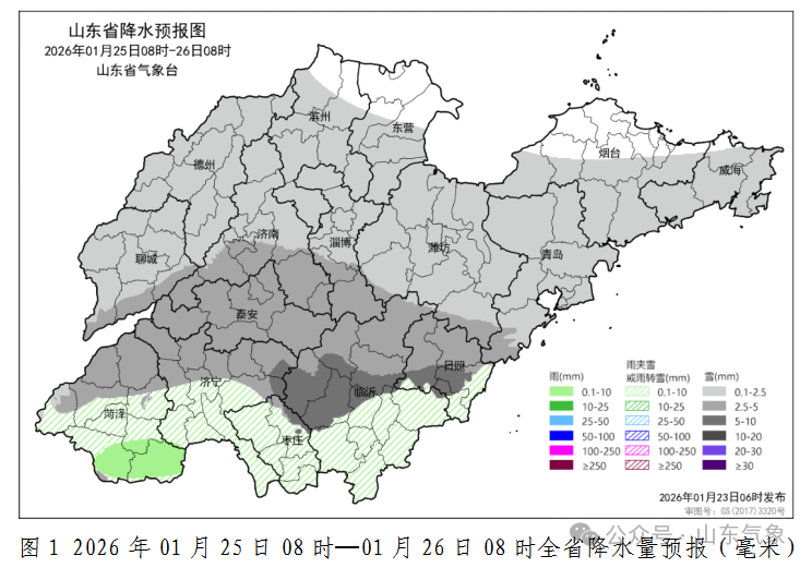 25日夜间到26日白天,全省天气阴,鲁南地区有雨夹雪转小到中雪局部大雪,其他地区有小雪局部中雪。半岛地区北风4级阵风5~6级,其他地区北风短时南风3~4级。最低气温:鲁中山区和半岛内陆地区-5℃左右,其他地区-3℃左右。最高气温:菏泽、济宁和鲁西北地区5℃左右,其他地区2℃左右。