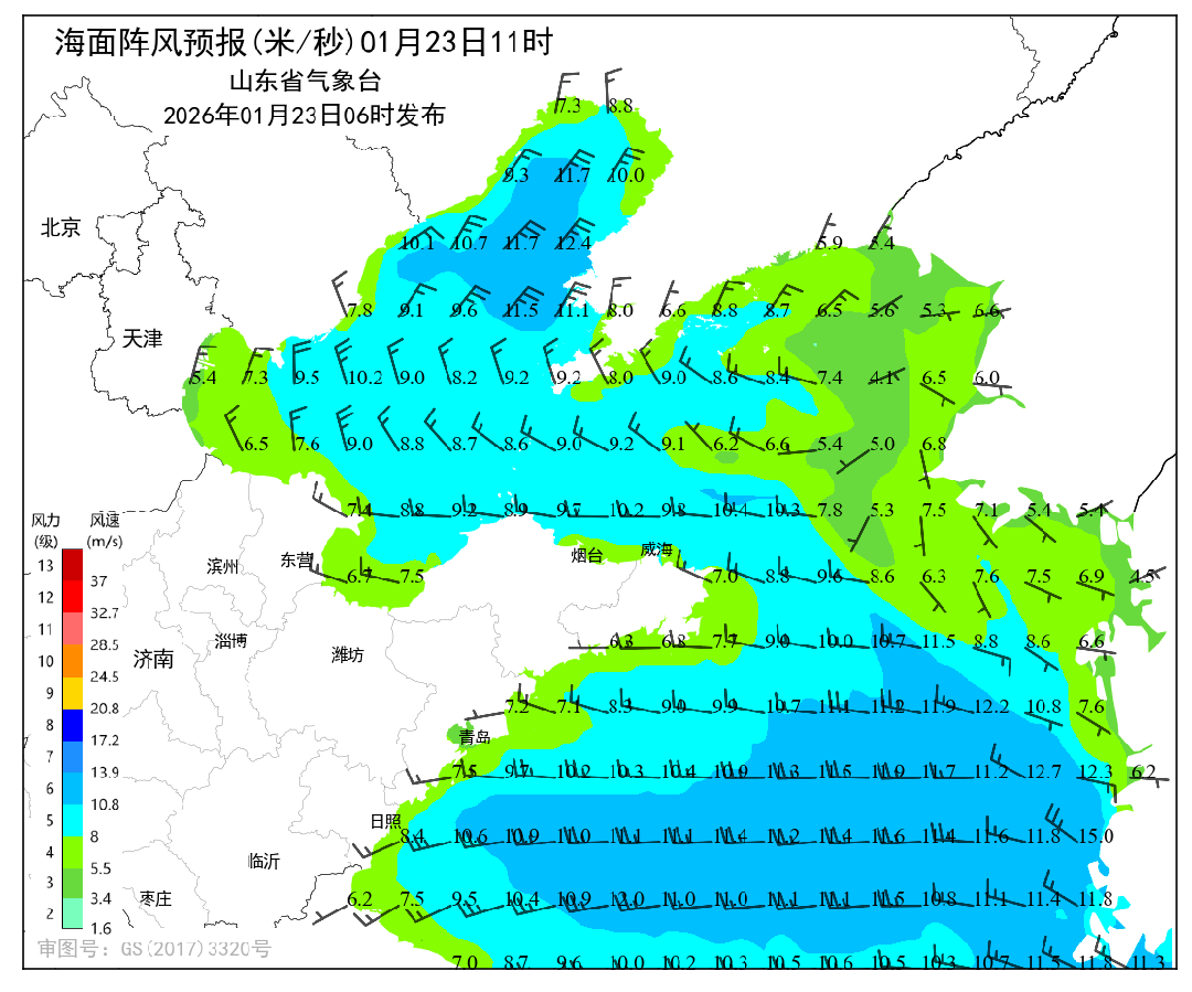 海上大风警报:23日下午到夜间,北风,黄海北部和中部6~7级阵风8级减弱到5~6级,渤海和渤海海峡5~6级;24日白天,渤海海峡和黄海北部北风5~6级,渤海和黄海中部北风转偏东风5~6级。