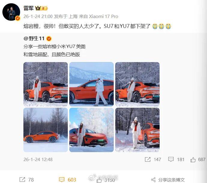 1月24日晚,小米集团创始人雷军通过微博发文,宣布小米SU7与YU7两款车型已下架熔岩橙配色。雷军在文中称赞该配色“很帅”,但同时坦言“敢买的人太少”,直言“一款车漆,好看而且大家都敢买,实在太难”。