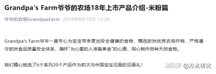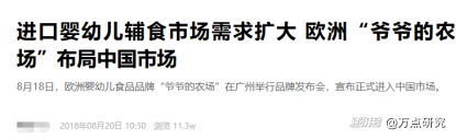 然而,在2018年产品正式推向市场时,呈现给大众的却是“欧洲血统”的品牌形象。万点研究查询发现,2018年首场发布会上,爷爷的农场以“欧洲荷兰婴幼儿食品品牌”的身份宣布进驻中国,创始人之一的何建农以中国区总经销商艾斯普瑞(广州)食品有限公司市场总监的身份接受采访时,直言“此次引进‘爷爷的农场’这一欧洲婴幼儿食品品牌”,并强调品牌 “欧洲原装进口”“品类丰富,有利于打通国内市场”。