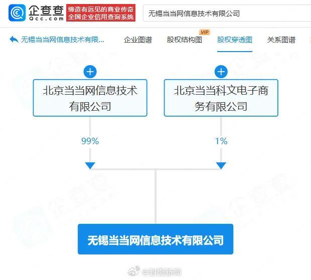 企查查股权穿透显示,无锡当当网信息技术公司由北京当当网信息技术有限公司、北京当当科文电子商务有限公司共同持股。
